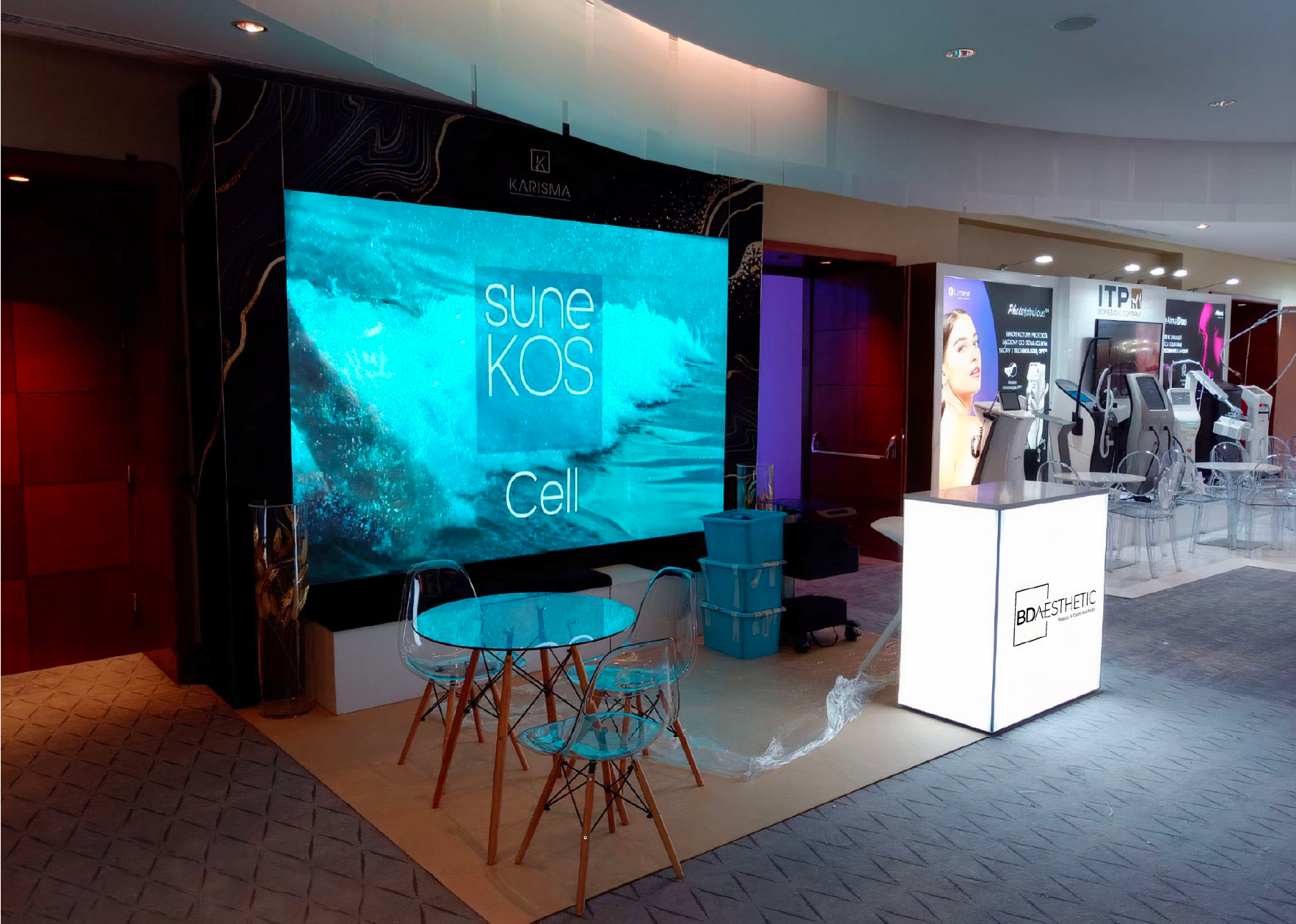 Podczas kongresu medycyny estetycznej przygotowaliśmy kompaktowe stoisko, w którym kluczowym elementem była ściana z wbudowanym ekranem LED. Mimo niewielkiej powierzchni ekspozycyjnej udało się stworzyć wyrazisty, nowoczesny punkt prezentacyjny, który skutecznie przyciągał uwagę odwiedzających.
